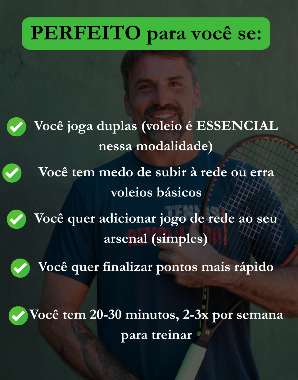 Essencial para jogadores de duplas (onde voleio é fundamental). Poderoso para simples (adiciona dimensão ofensiva que surpreende adversários). Finalize pontos rapidamente ao invés de ficar apenas na linha de base.